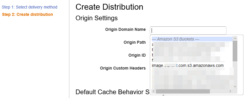 - 여러가지를 입력해야 하는데 제일 중요한 부분은 Origin Domain Name 임. [Orign Domain Name]을 클릭하면 생성한 S3 bucket list 가 나오는데 아까 생성한 image.xxx.com 을 선택한다.