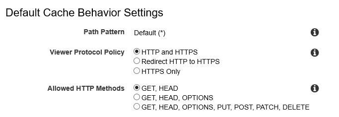 : Viewer Protocol Policy ( Http and Https, Redirect Http to Https, Https only 세가지 옵션이 있다. Https는 인증서 발급이 필수이며 없는 경우 Http and Https 로 선택한다. )