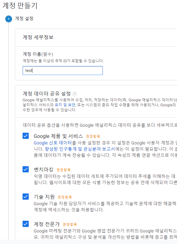 (아래에 계정 데이터 공유 설정은 권장사항대로 전체를 선택하였습니다.)