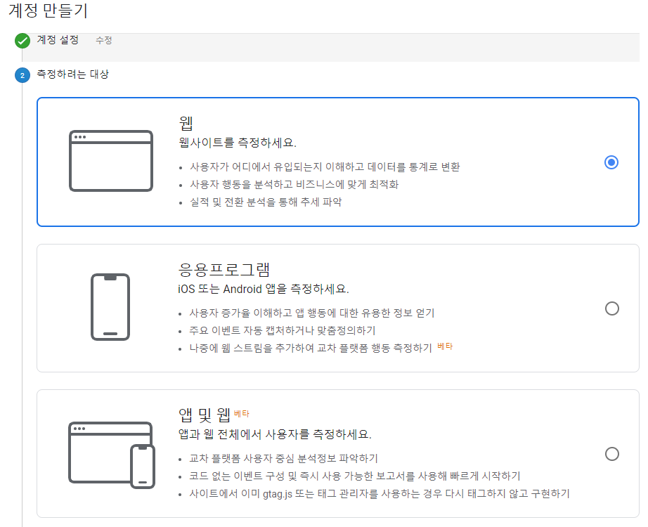 웹 또는 앱, 웹/앱을 동시에 측정할 수 있는데, 저는 홈페이지 트래픽을 측정하려는게 목적이고,