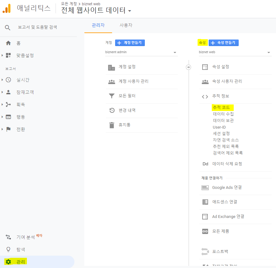 여기까지 끝나면 등록ID 를 얻게 됩니다. 만약 등록ID(추적ID) 를 찾기 어려우시다면 '관리 > 속성 > 추정 정보 > 추적 코드' 항목에서 확인 할 수 있습니다.