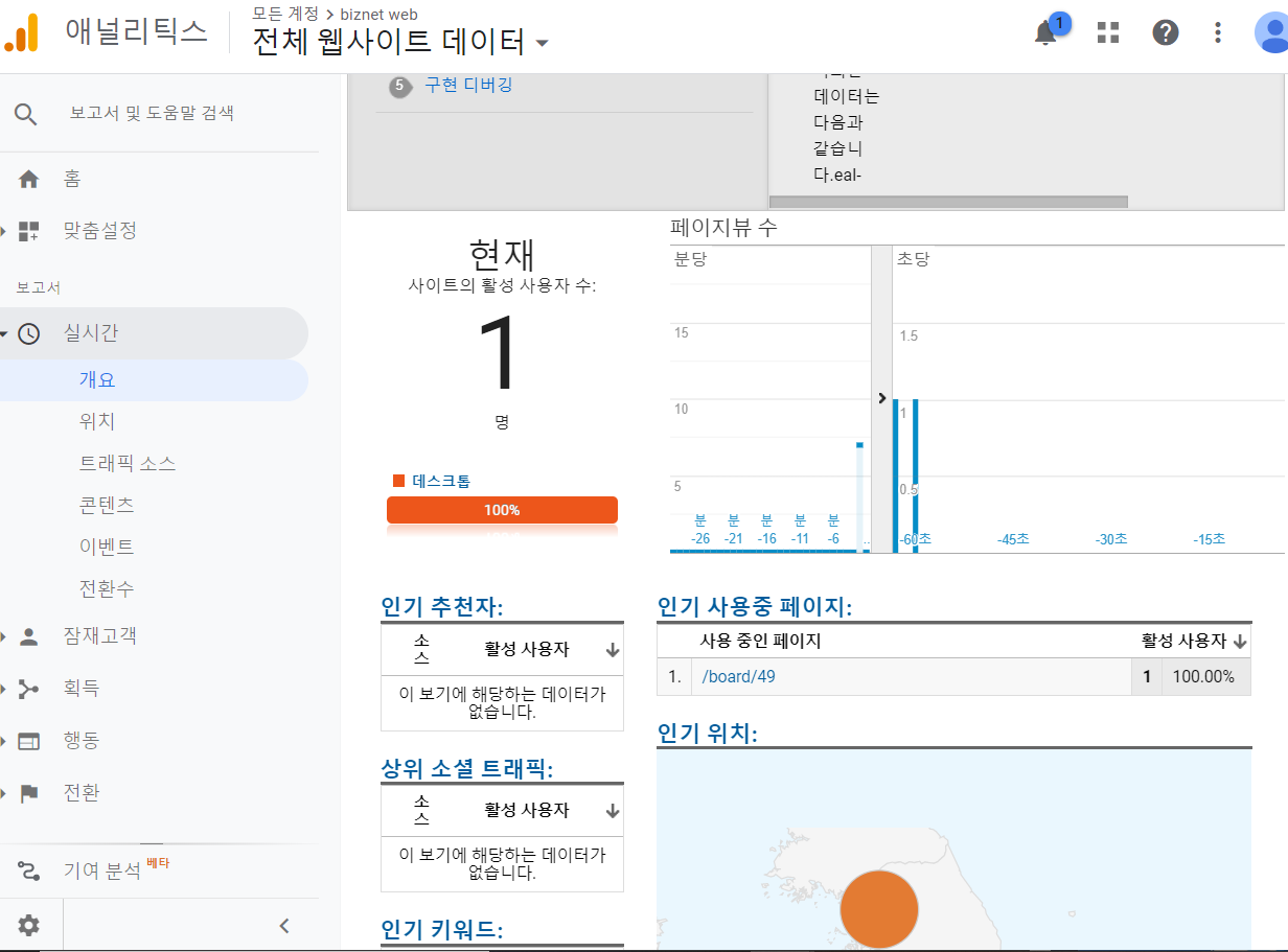 자 이제 테스트를 위해 새로 적용된 사이트에 방문한 뒤 구글 애널리틱스에 접속해 봅니다.