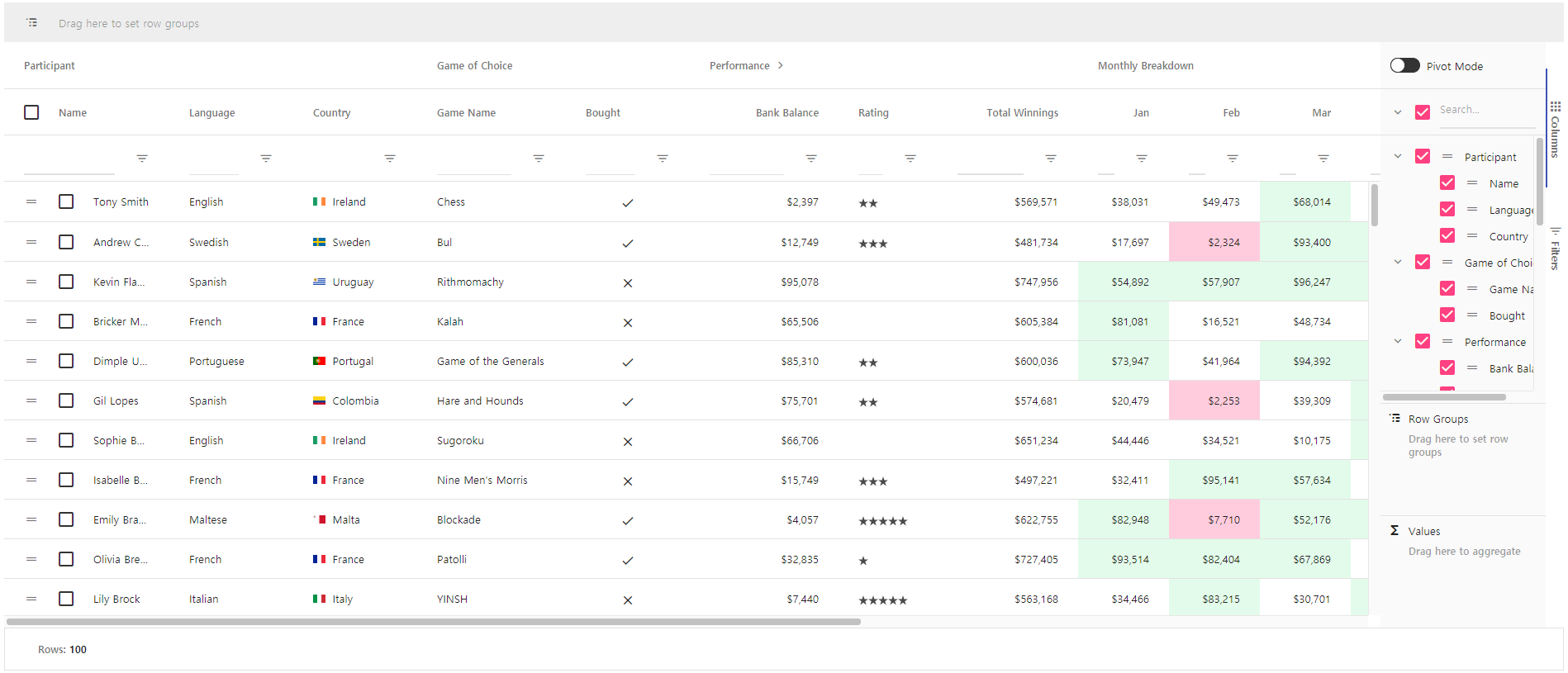 상용버전에서는 서버사이드 랜더링, 엑셀 추출, Master-Detail 구조, Tree, Pivot 등을 지원하며, 무료버전에서도 왠만한 기능은 모두 지원하고 있습니다.
