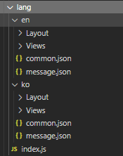 lang의 index.js에서는 하위의 json파일을 읽고 하위 디렉토리 또는 파일명을 읽어 message의 하위 속성으로 자동으로 등록합니다.