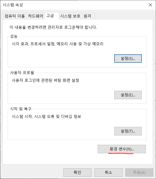 설치 후 환경변수를 설정합니다. (시스템 -> 시스템 정보 -> 고급시스템설정 -> 환경변수 -> 새 사용자 변수 추가