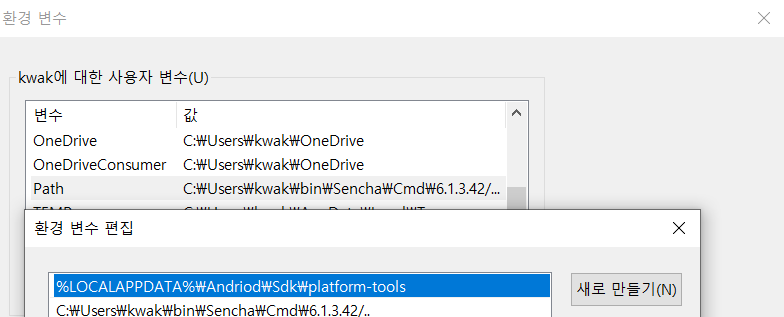 환경변수에서 사용자변수의 'Path' 를 선택 -> 편집 -> 새로 만들기 후 아래 경로를 추가합니다.