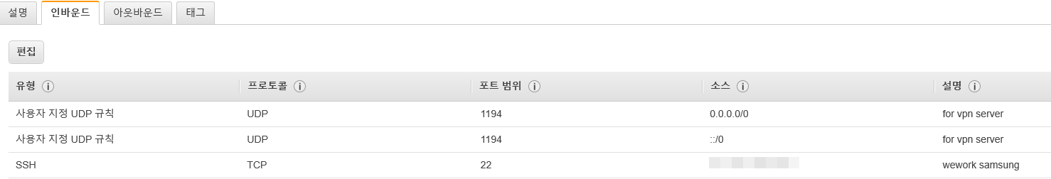설정시 보안그룹에서 inbound를 아래와 같이 설정. (1194 포트는 vpn 접속용, 22번 포트는 ec2 관리용)