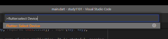 이제 안드로이드 에뮬레이터로 실행을 해보겠습니다. ctrl+shift+p 를 눌러 명령 팔레트를 연후 flutter:Select Device 라고 입력한 뒤 선택 합니다.