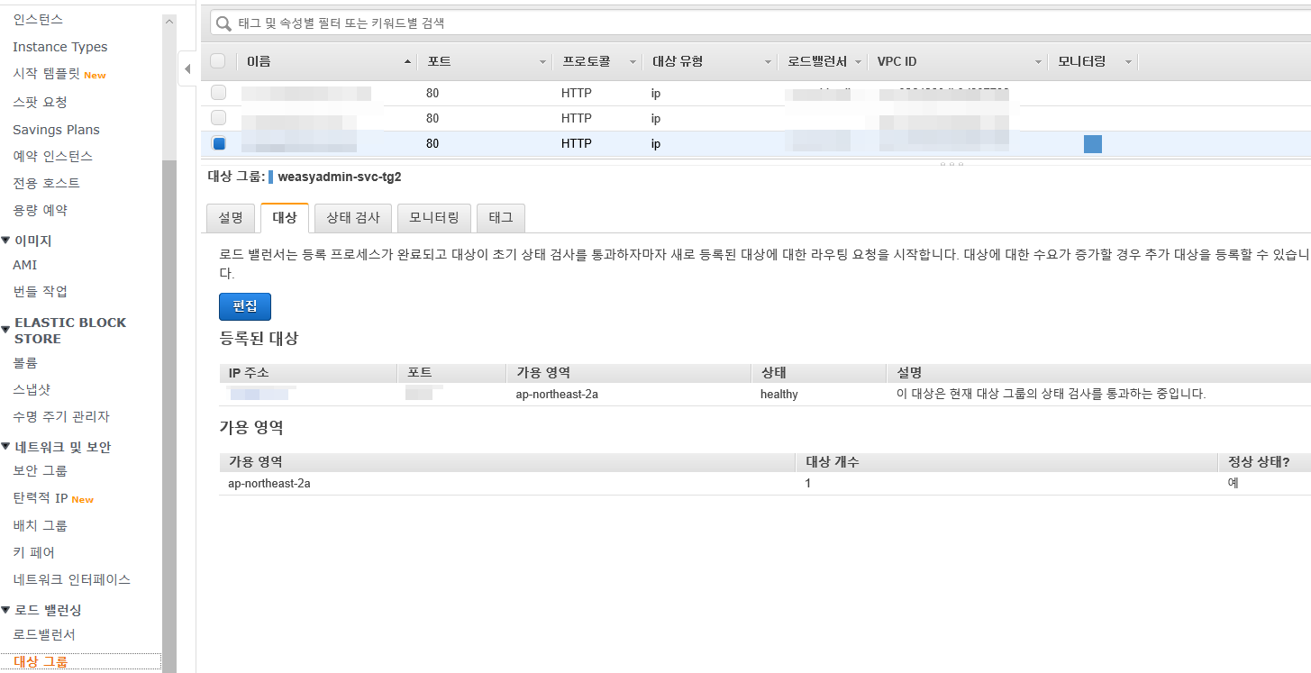 작업그룹이 잘 배포되고 있는지 확인하기 위해서는 EC2로 이동하여 대상그룹을 선택하면 알수 있습니다.