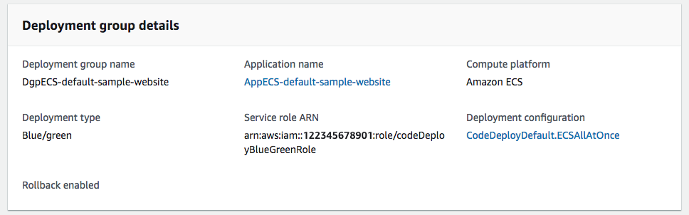 배포 그룹 이름을 클릭하면 배포에 대한 세부 정보를 볼 수 있습니다. [Deployment type] 아래에 [Blue/green]이 표시됩니다. [Deployment configuration] 아래에는 CodeDeployDefault.ECSAllAtOnce가 표시됩니다. 이는 상태 검사에 통과하면 CodeDeploy가 Application Load Balancer의 리스너를 업데이트하여 트래픽의 100%를 타겟 환경(녹색)으로 전송한다는 것을 나타냅니다.