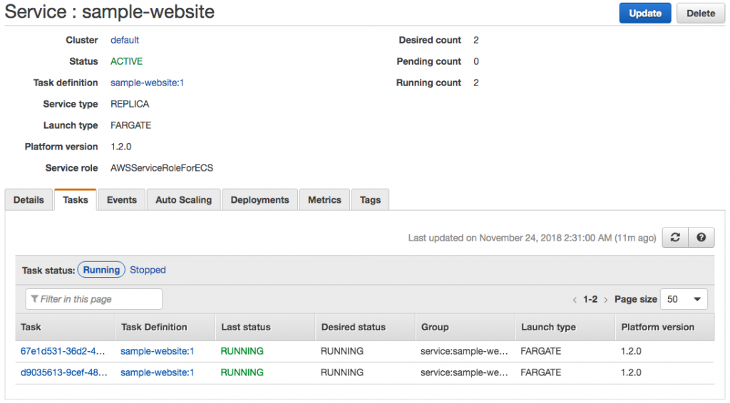 이제 새로 생성된 서비스에서 하나 이상의 작업이 실행 중인 것을 확인할 수 있습니다.